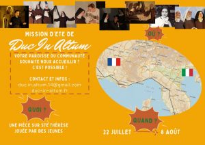 Si vous souhaitez faire venir la troupe Duc In Altum dans votre paroisse, communauté religieuse, n’hésitez pas à nous contacter